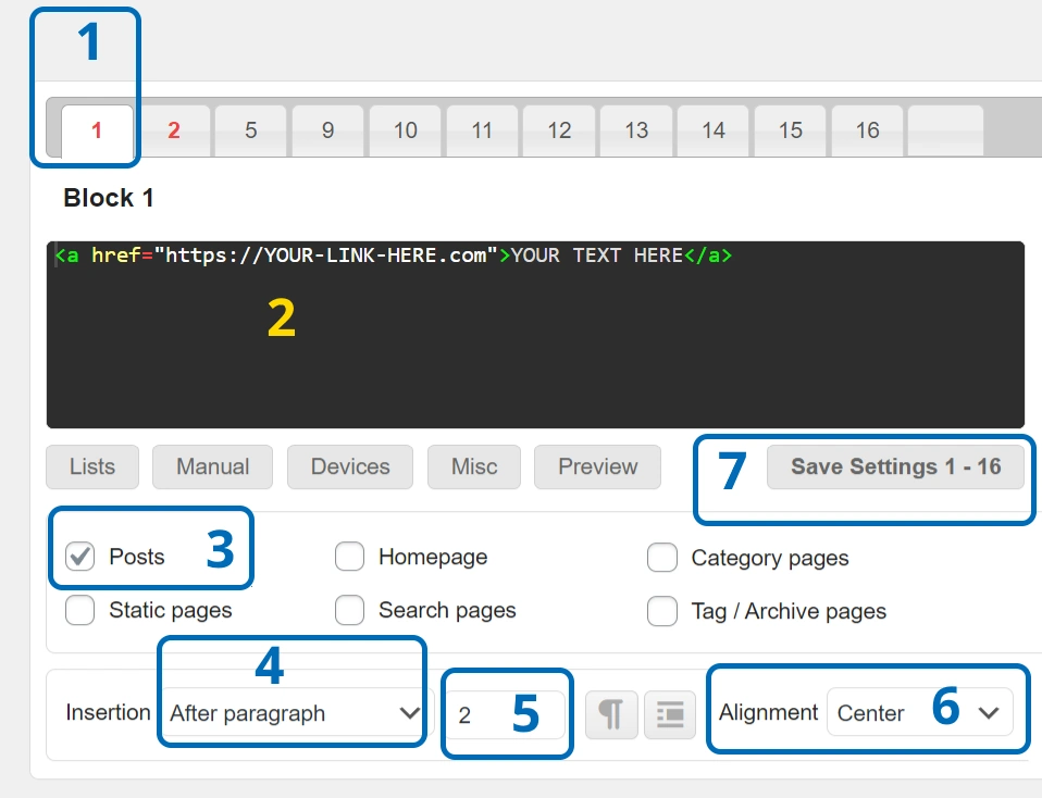 Example: If you wanted to add a link that points to an offer of yours, after the 2nd paragraph on all your posts, the set up would look something like this:
