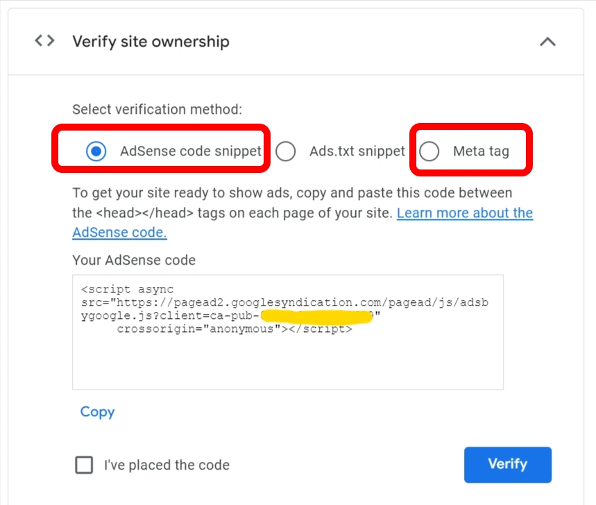 To get verified for Adsense, choose either the FIRST option (AdSense code snippet) or the THIRD option (Meta tag).